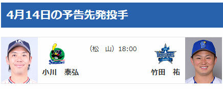 DeNA 登録&抹消なし 4/14(火)の予告先発 (S-DB)小川泰弘×竹田祐