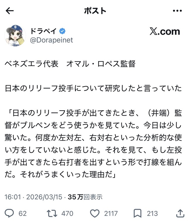 ベネズエラ監督「日本の継投が全く分析的じゃなくて逆に驚いた」