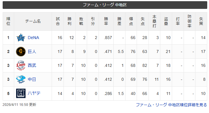 DeNA、ファーム・リーグ中地区で独走状態 貯金を独占!