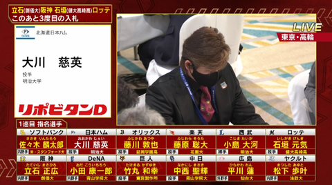 日本ハム、外れ外れ1位 入札で明治大・大川慈英 交渉権獲得!