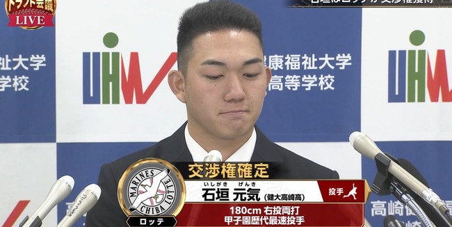 ロッテ、ドラ1石垣元気を2球団競合の末、交渉権獲得きたぁぁぁぁぁあぁ!!!!