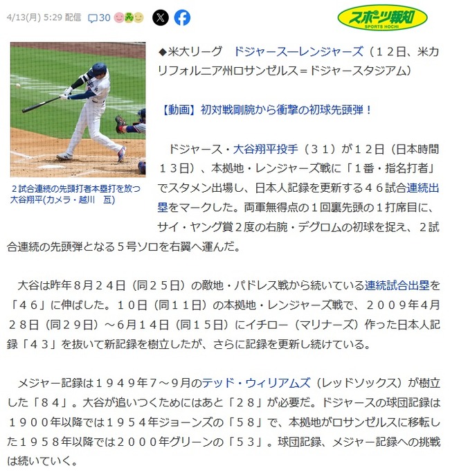 大谷46試合連続出塁であと28試合でメジャーの連続試合出塁記録に並ぶ。メジャー記[...]