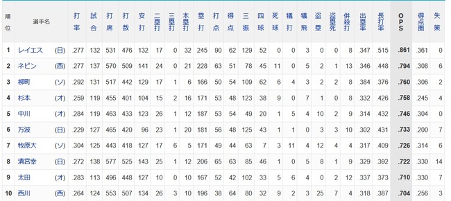 パ・リーグOPSランキング1位レイエス、2位ネビン←これwwwwwwwwwwww[...]