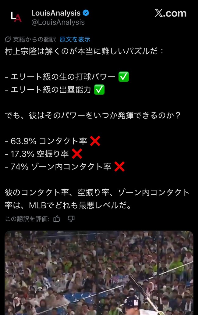MLB評論家さん 村上宗隆のデータを見て不安になってしまう