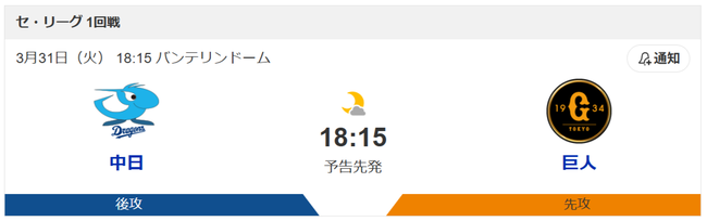 明日からの中日VS巨人戦