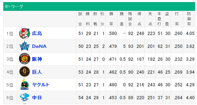 セリーグ2位~6位が1.5G差の大混戦wwwwwww