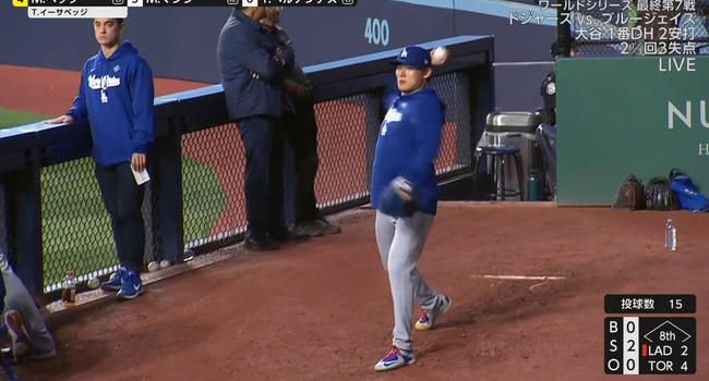 山本由伸がキャッチボール開始 2点ビハインドの8回攻撃中から本格的スクランブル準[...]