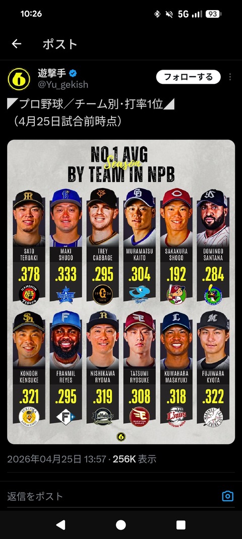 各球団の首位打者、出揃う