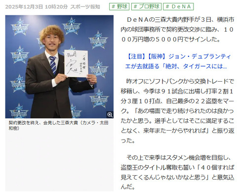 DeNA三森が1000万円増の5000万円で契約更改 盗塁王誓う「40個すれば見[...]