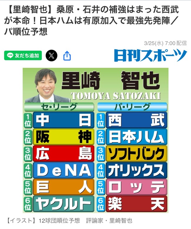 解説者の2026パリーグ順位予想wwwww