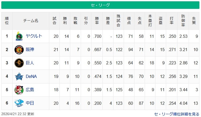 [2026/4/21] DeNAベイスターズ16-9阪神タイガース 14安打16[...]
