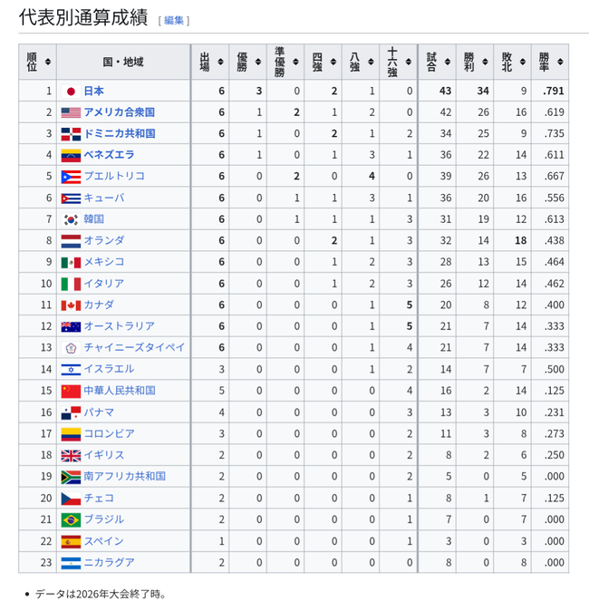 WBC通算成績、日本がダントツwwwwwwwww