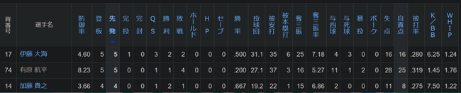 千賀滉大 5先発 0勝4敗 防御率9.00 被打率.313 K/BB1.77 W[...]
