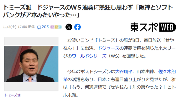 トミーズ雅 ドジャースのWS連覇に熱狂し思わず 「阪神とソフトバンクがアホみたい[...]