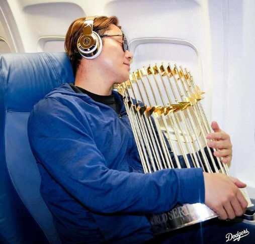 山本由伸さん、優勝トロフィーを抱いて機内でグッスリ眠る