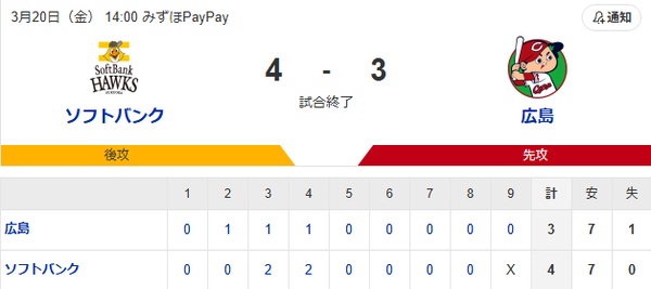 ソフトバンクが広島に逆転勝ち!復帰の柳田が2安打2打点の活躍、笹川が4回に決勝2[...]