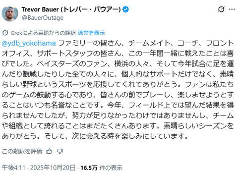 「ファンはゲームの心臓」DeNAバウアーがXで退団示唆の長文メッセージ!感謝とと[...]