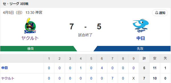 4/5 中日 5-7 ヤクルト 5点リード守れず逆転負け・・開幕から3カード連[...]