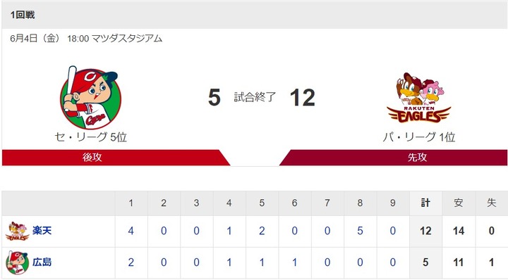 広5-12楽[2021/6/4] 中村祐4回5失点 大道2回2失点 中崎5失点 [...]