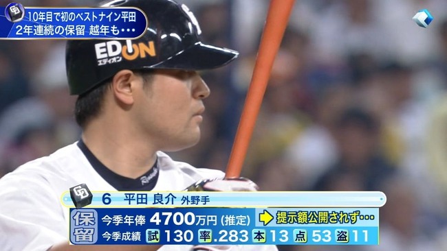 中日平田の来季の適正年俸