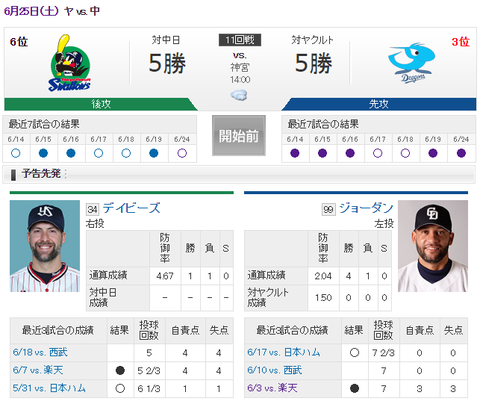 6/25 中日 vs ヤクルト(神宮)14:00開始