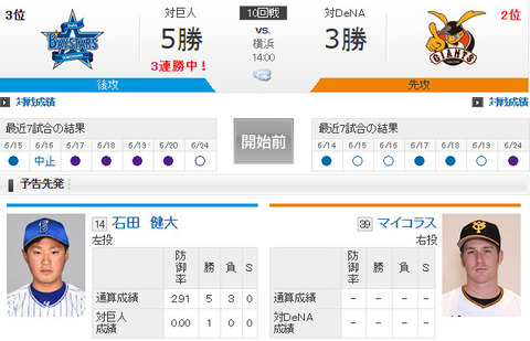 巨人、マイコラスが今季初先発、スタメンマスクは実松、セカンドは片岡