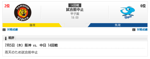 7/5 中日 vs 阪神(甲子園)【試合中止
