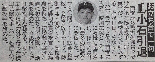 巨人、元西武小石と元広島横山を打撃投手として獲得