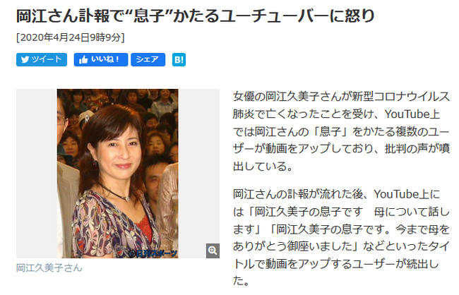 Youtubeで岡江久美子さんの息子の大量発生、ニュースになってしまう