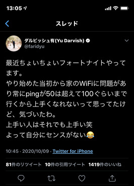 ダルビッシュ有「フォートナイトやってます。Wi-FiでPingは50から100で[...]